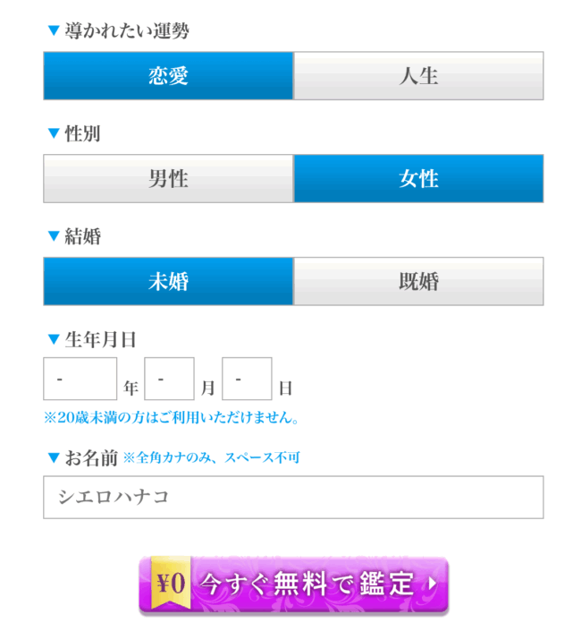 導かれたい運勢、性別、結婚、生年月日、カタカナで名前を入れたら今すぐ無料鑑定をクリック