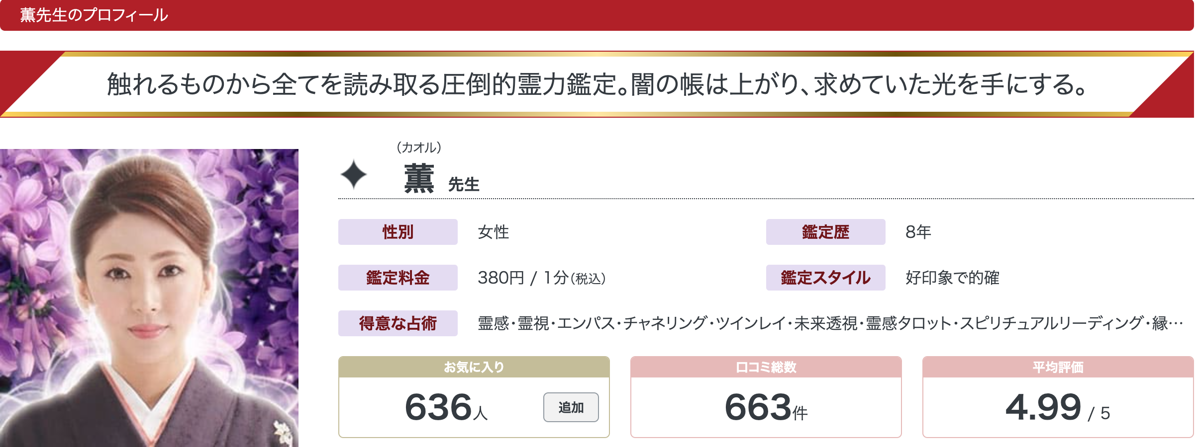 魂の鼓動を磨き、全てを希望へと変換する鑑定師として、リピーターも多く口コミ評価は4.99と高評価の先生です。
