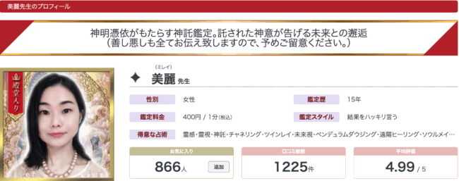 御神仏、守護霊様、ご先祖様など、相談者とのご縁を持った所縁の深い高次の存在からの「お告げ」を聞くことができる先生は美麗(ミレイ)先生だけ。