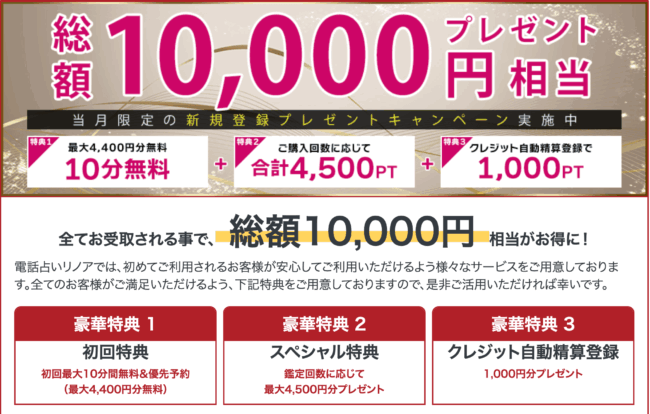 電話占いリノアでの初回登録でもらえる特典を利用すれば、10分間無料で占ってもらえます。