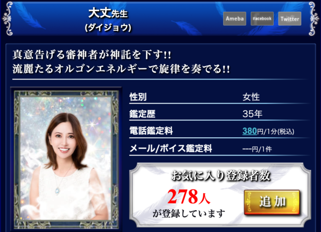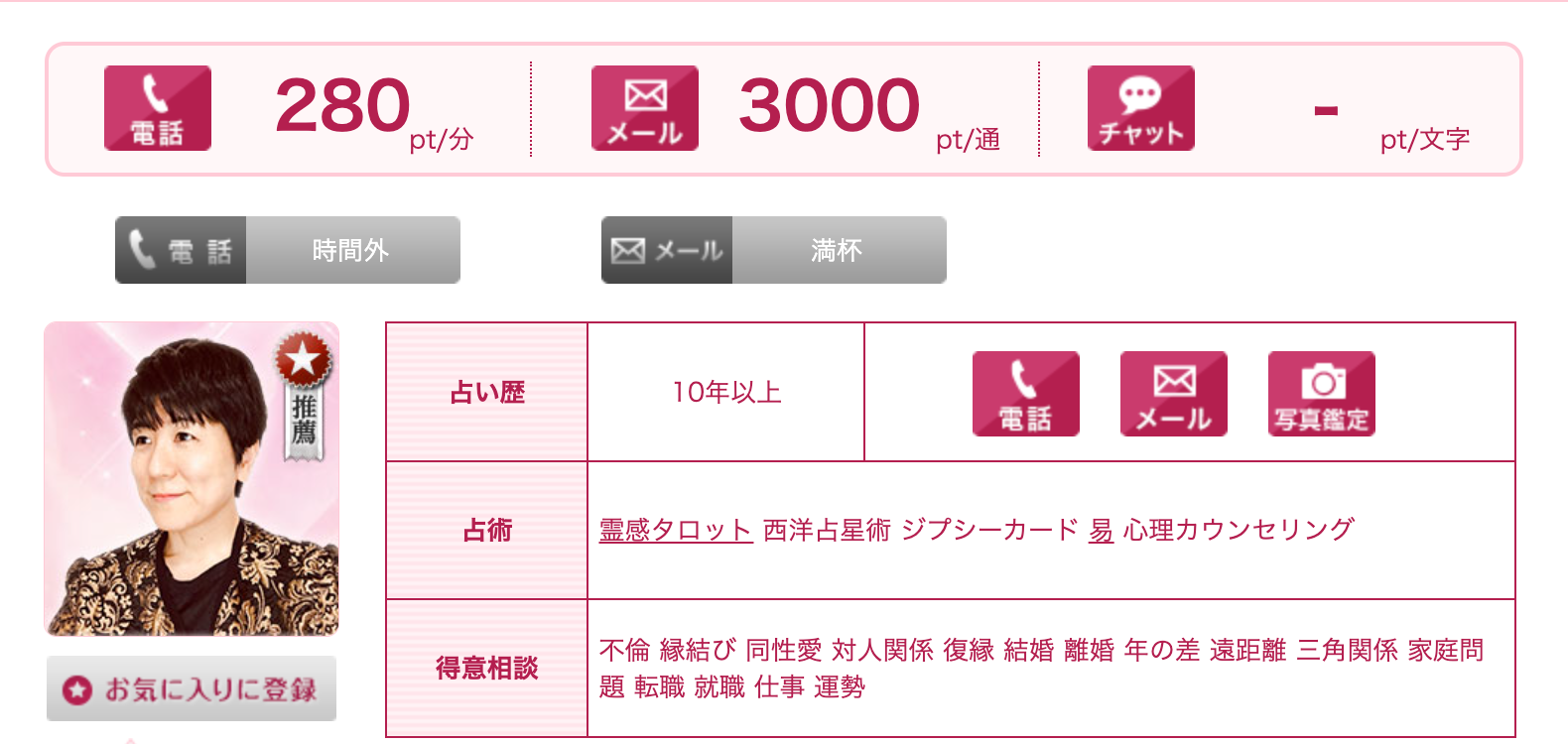 占い業界に精通されている方なら誰もが知っている有名な先生です。リズミカルな早い口調でお話されますが、霊視 透視で見出す結果は心にズシリと響き、後のスッキリとした印象が忘れられなくなるような占いです。