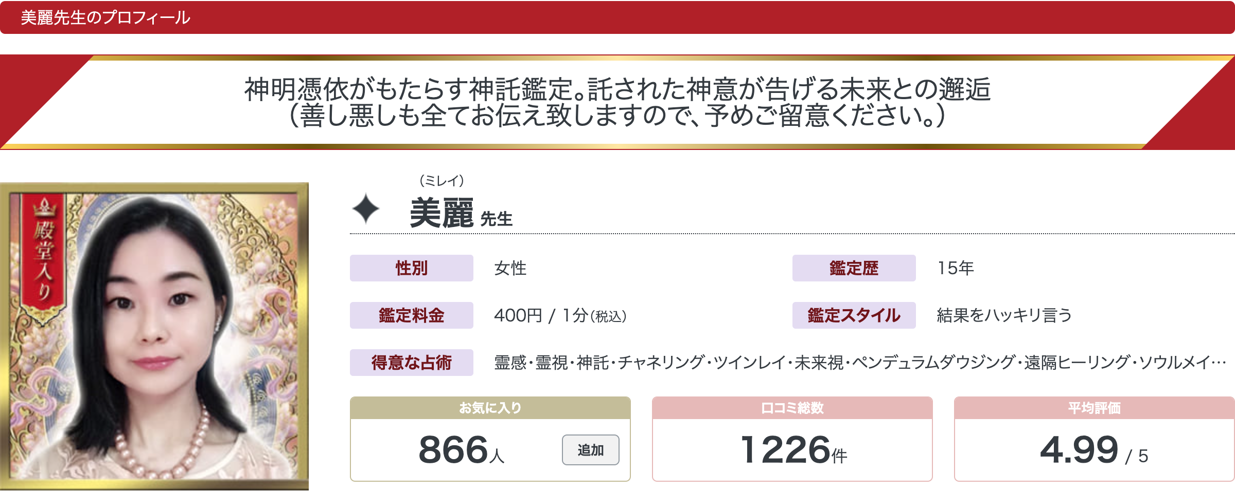 御神仏、守護霊様、ご先祖様など、相談者とのご縁を持った所縁の深い高次の存在からの「お告げ」を聞くことができる先生は美麗(ミレイ)先生だけ。