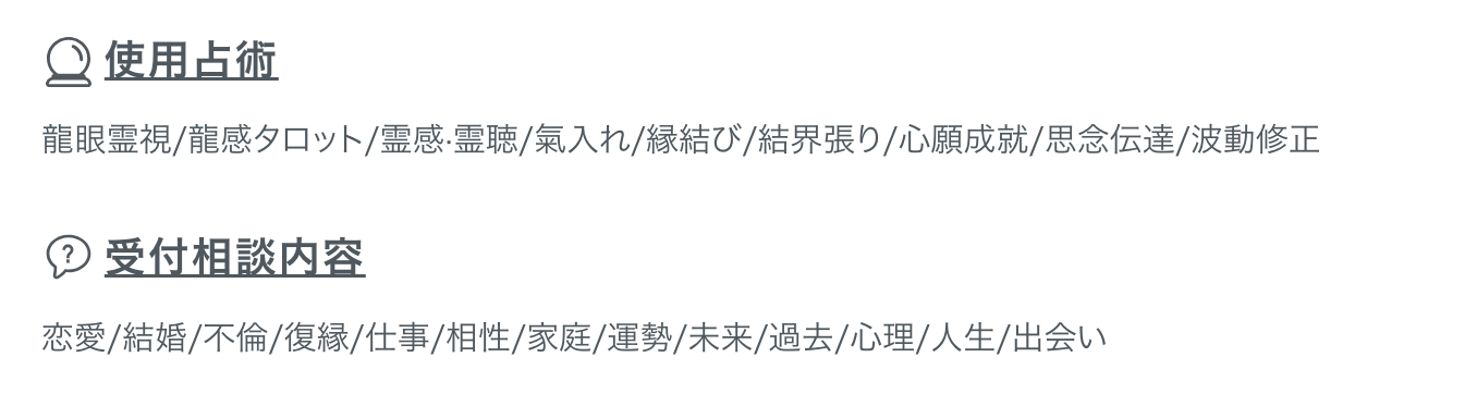 | 得意相談 | 恋愛・不倫・相手の気持・結婚・家庭内の問題・子育て・人間関係・仕事・適職・心の悩み・霊的事象・トラウマ など。 上記以外のことも気兼ねなくご相談ください。 |