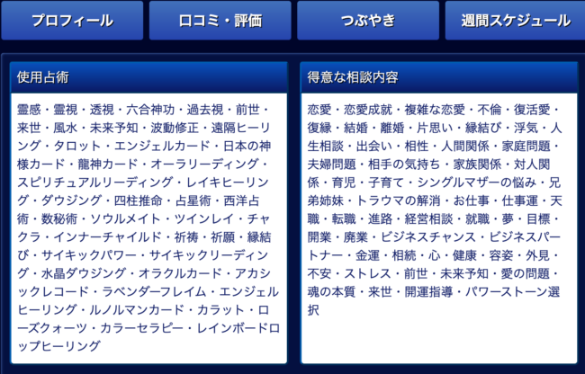 電話占いウィルでは、先生ごとにどんな占いを得意としているのか、先生のプロフィールに詳しく記載されています。